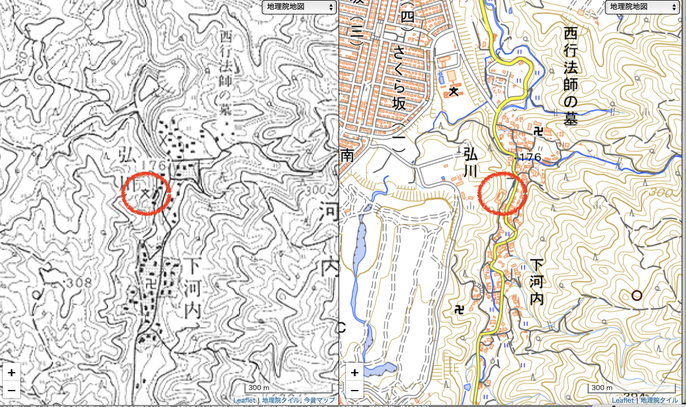 そこで「今昔マップ on web」という新旧地図を比較できるサイトで調べてみると学校のマークが古い地図にはあって現代のには無い場所を見つけました。