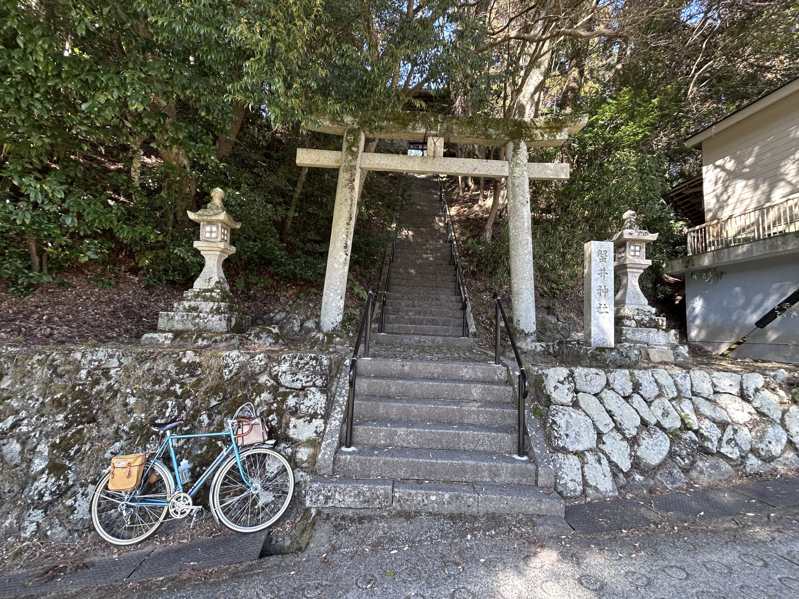 蟹井神社に行ってみますが境内は石段の上で陽も差さないのでボツ。